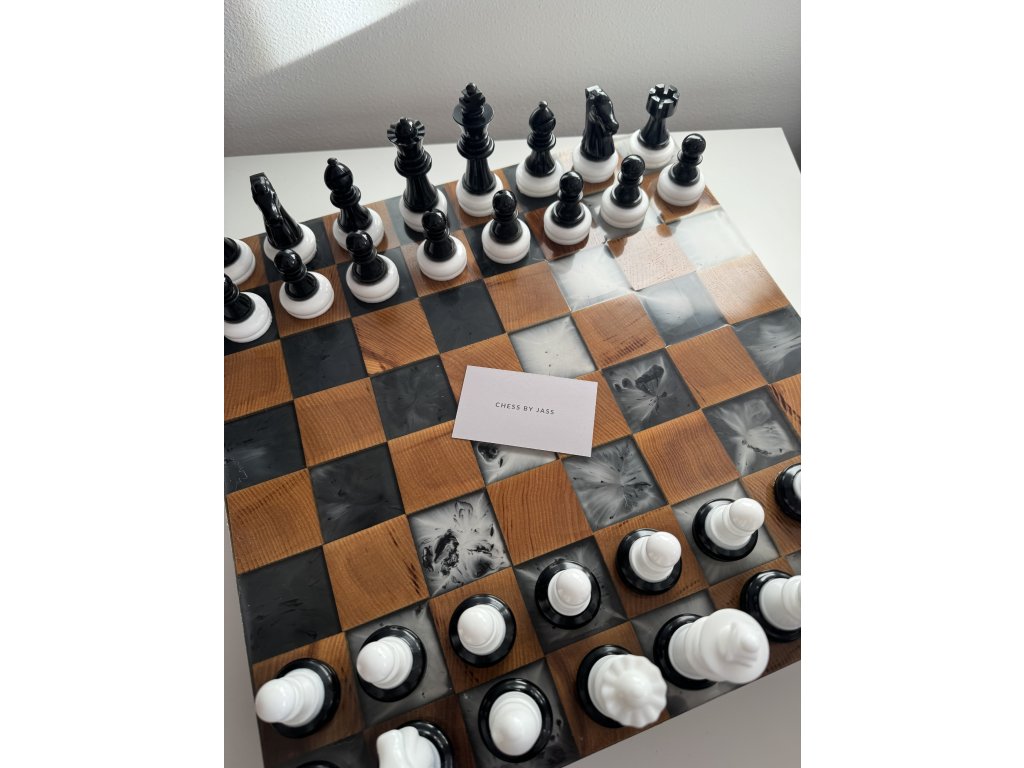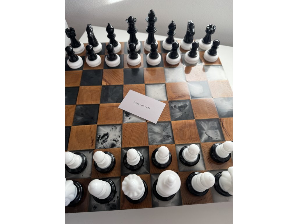 Ručně vyráběná šachová souprava z jasanového dřeva a epoxidové pryskyřice černé a bílé barvy.
