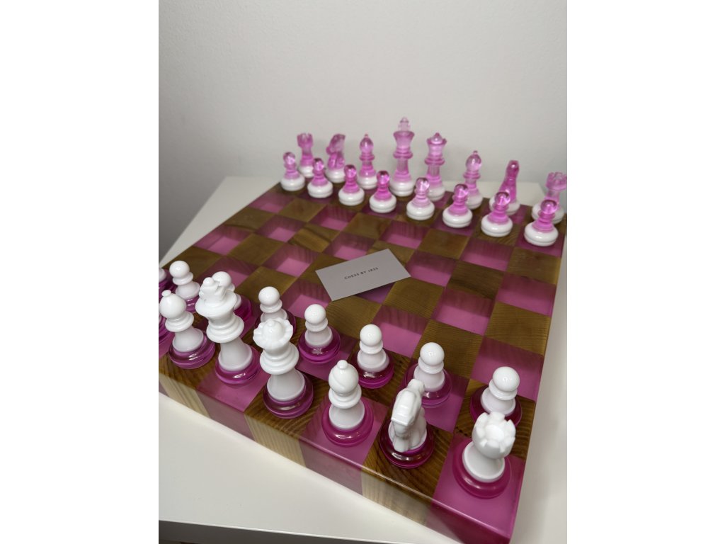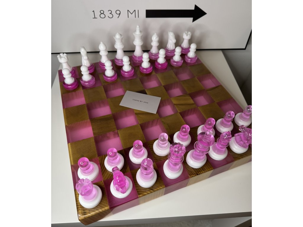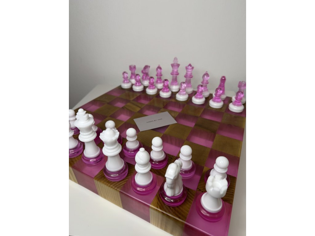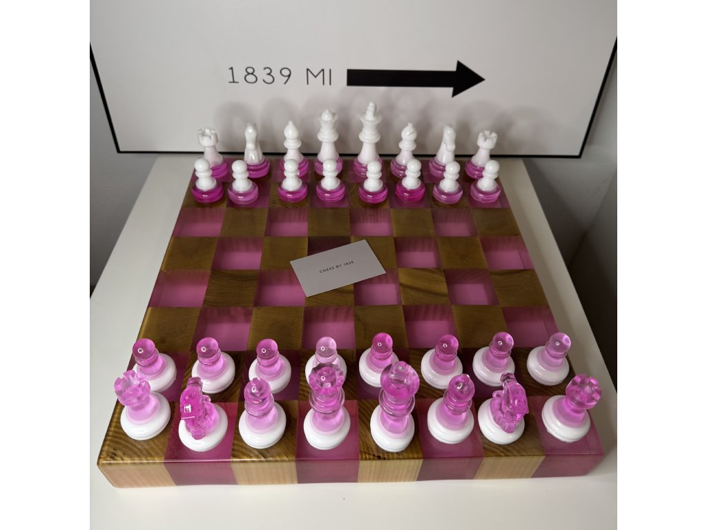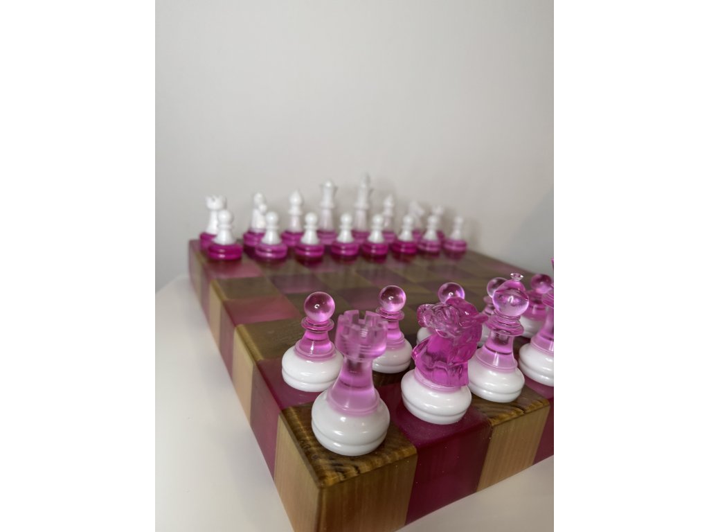 Ručně vyráběná šachová souprava z růžové epoxidové pryskyřice a jasanového dřeva.