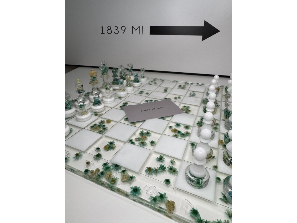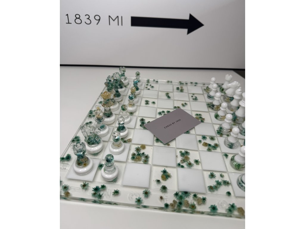Každý tah může být uměleckým zážitkem. Ručně vyráběná šachová souprava Flowers Green spojuje křehký půvab sušených květin s moderní elegancí epoxidové pryskyřice v tónech zelené a bílé.