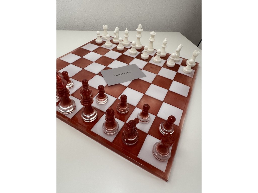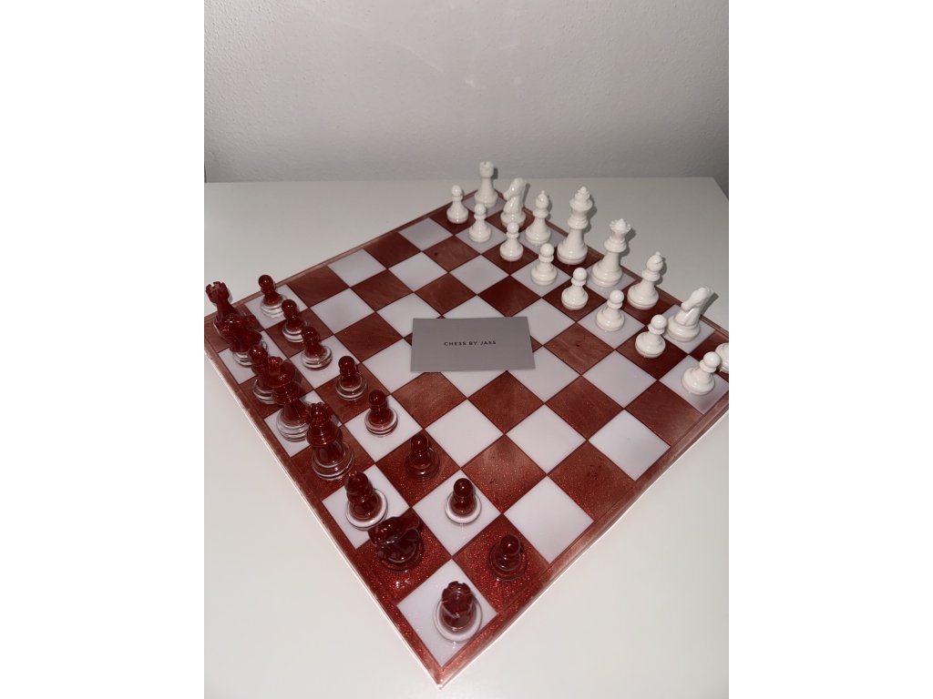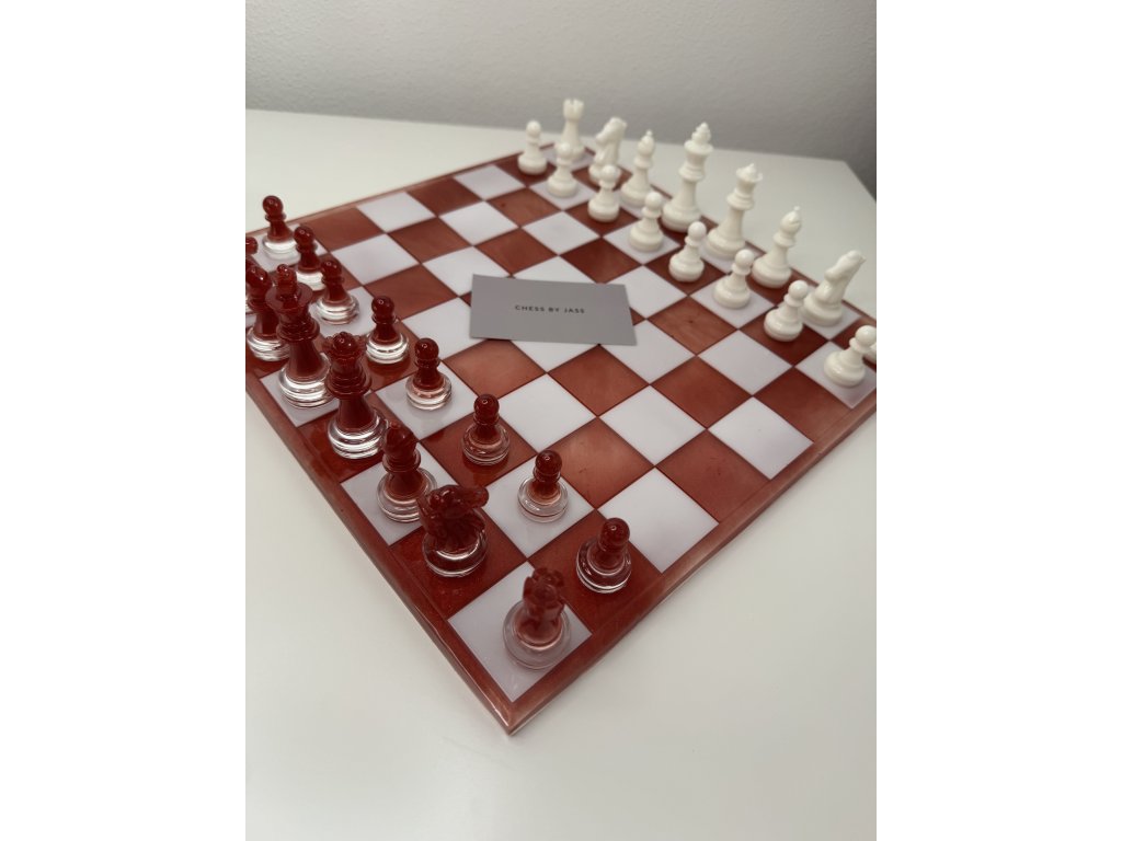 Šachová souprava z epoxidové pryskyřice v kombinaci červené a bílé barvy.