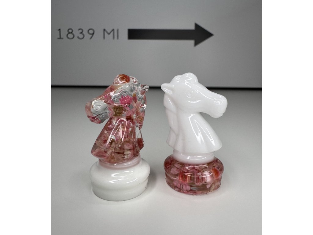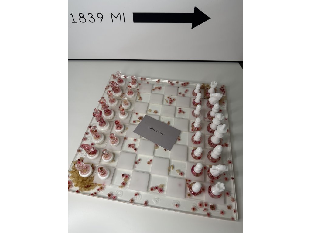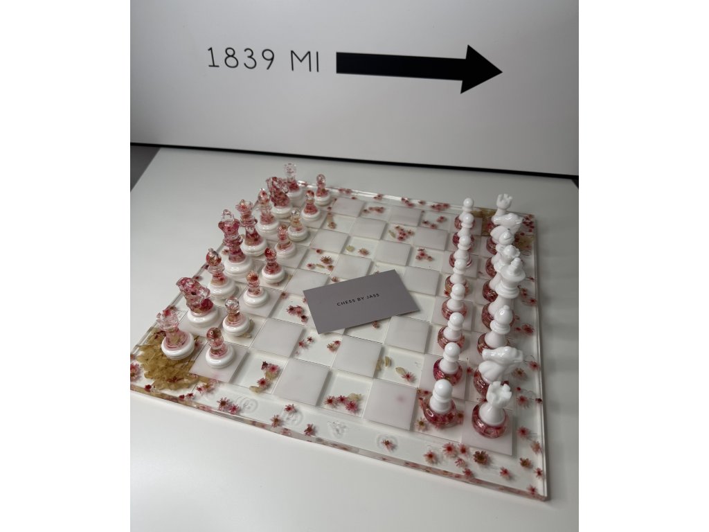 Každý tah může být uměleckým zážitkem. Ručně vyráběná šachová souprava Flowers Pink spojuje křehký půvab sušených květin s moderní elegancí epoxidové pryskyřice v tónech růžové a bílé.