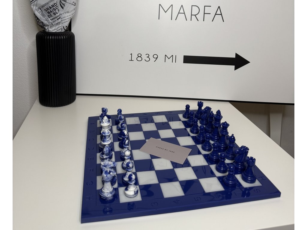 Ručně vyráběná šachová souprava z epoxidové pryskyřice inspirovaná tradičním designem ve spojení bílé a modré barvy. Nadčasová elegance s originální barevností, která ozdobí každý interiér.