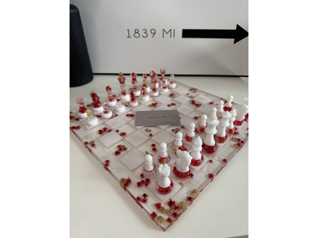 Každý tah může být uměleckým zážitkem. Ručně vyráběná šachová souprava Flowers Red spojuje křehký půvab sušených květin s moderní elegancí epoxidové pryskyřice v tónech zelené a bílé.