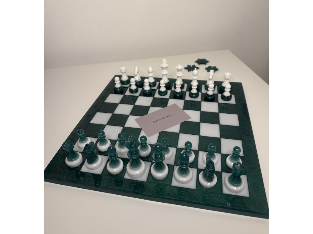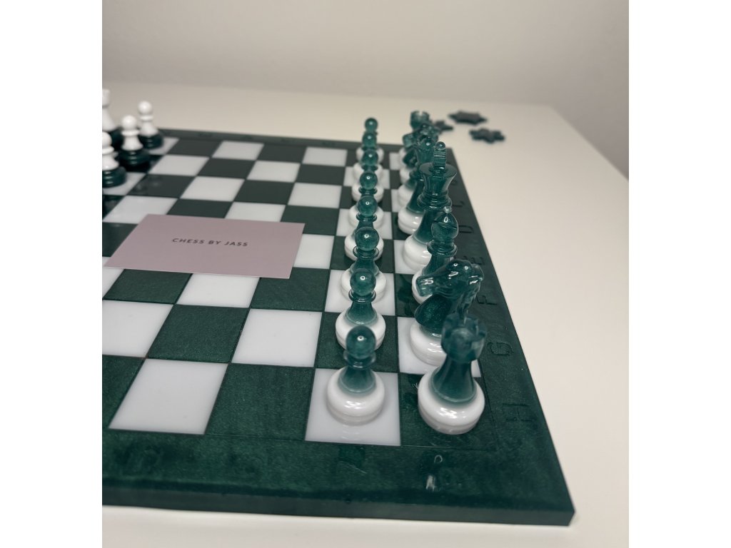 Šachová souprava z epoxidové pryskyřice v kombinaci smaragdově zelené a bílé barvy.